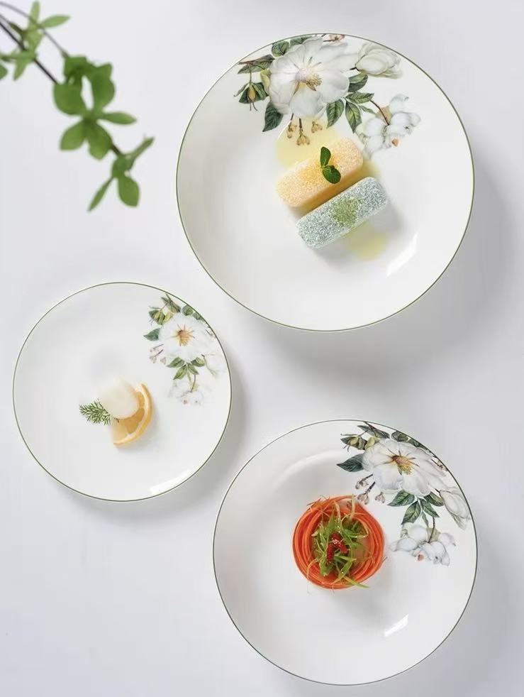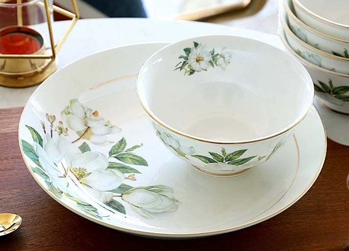 Enhance your dining experience with our complete fine bone china dinnerware set. This elegant collection includes beautifully crafted plates and bowls with delicate floral patterns, offering timeless charm for any table. Made with premium ceramic and in-glazed technology, each piece is safe, non-toxic, chip-resistant, and easy to clean — perfect for daily family use or special gatherings.