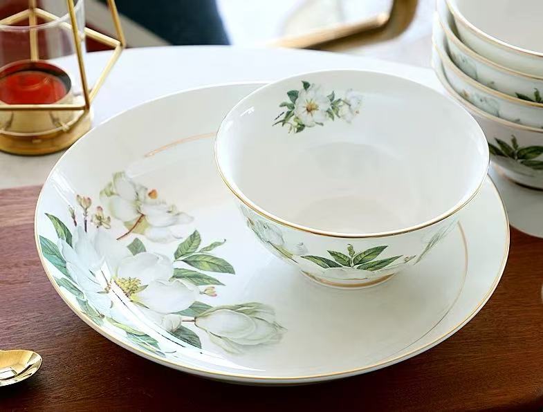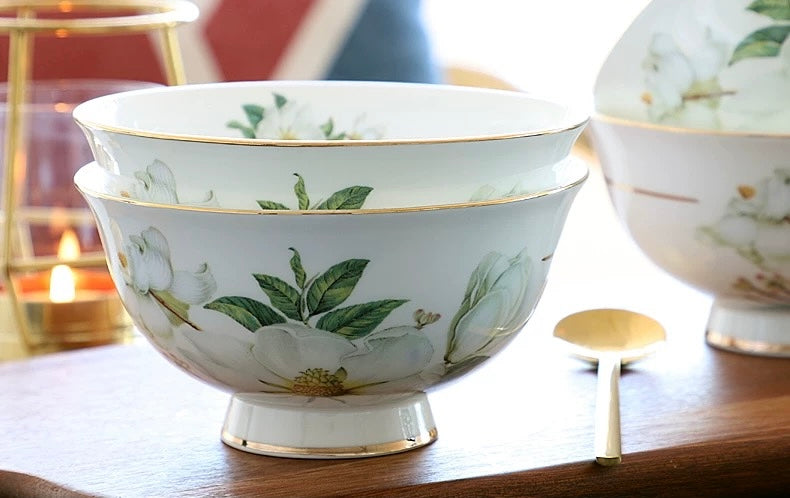 Minimal yet refined—these bone china bowls combine graceful floral art with timeless craftsmanship for a serene dining experience.
