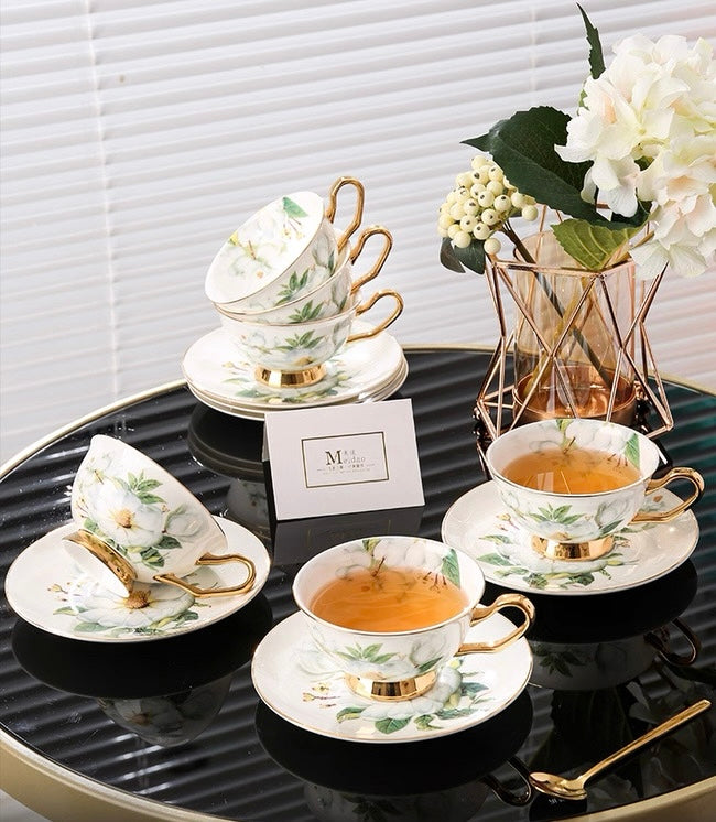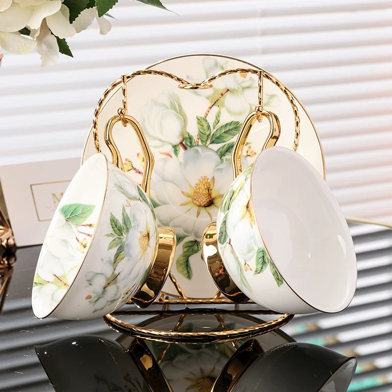 Enjoy your coffee in refined style with our Camellia Bone China Coffee Cup Set. Handcrafted with delicate floral patterns and elegant gold rims, each piece brings sophistication to your daily brew. Perfect for coffee lovers who appreciate beauty, quality, and a touch of luxury in every sip.