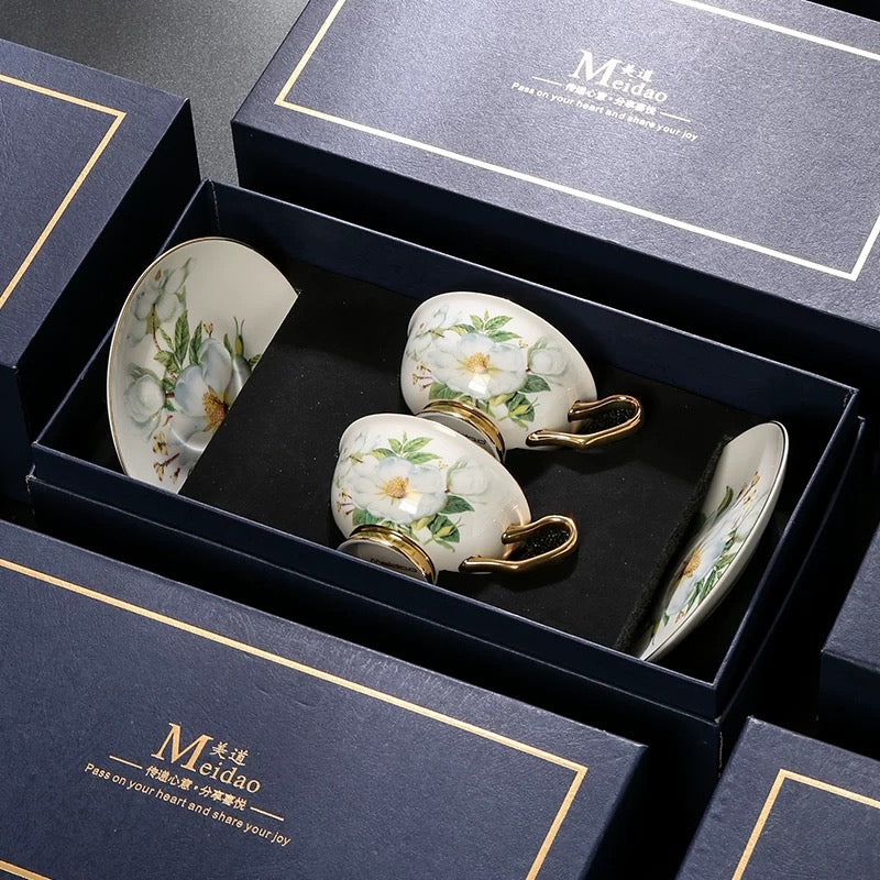 This exquisite bone china coffee cup set combines graceful camellia art with a gleaming gold finish. Ideal for espresso or cappuccino, it’s beautifully packaged for gifting and perfect for adding a refined touch to any coffee table.